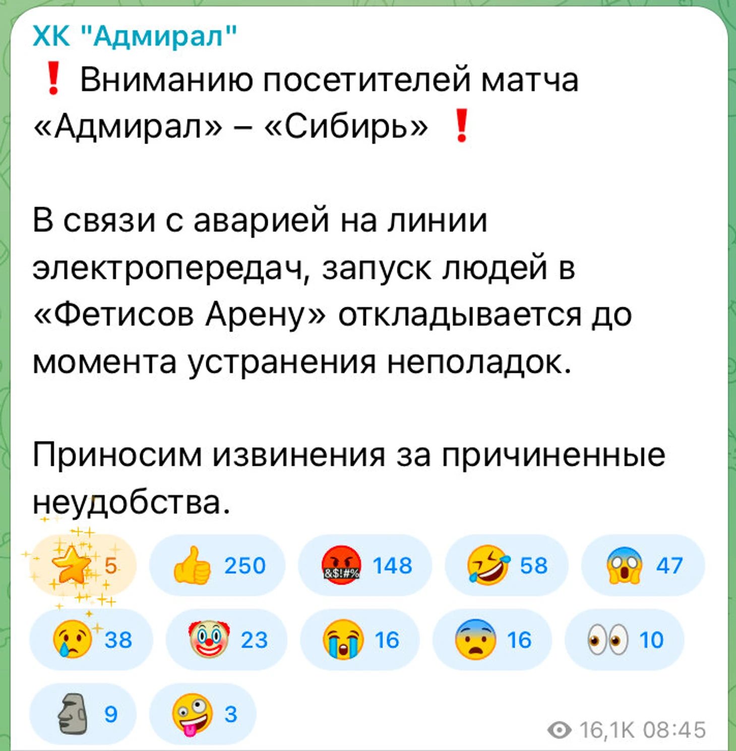 Через 40 минут появилась обновленная информация – об устранении аварии к 17:00 (10:00 по Москве). На это время изначально и было запланировано начало матча, но уже ни о каком проведении игры в срок речи не шло: болельщики должны были сначала попасть на трибуны, а хоккеисты – провести раскатку.