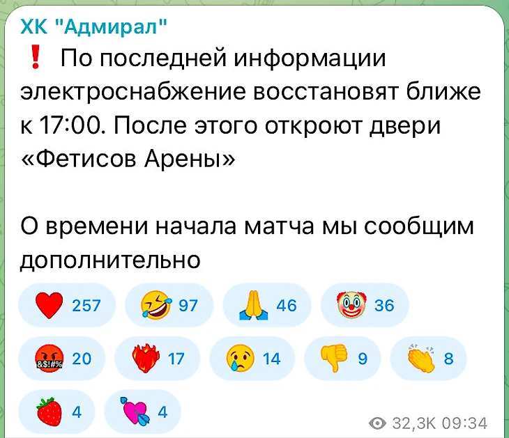 Ничто не предвещало беды, но в 15:45 по местному времени (8:45 по московскому), когда до начала матч оставалось чуть больше часа, официальные медиа «Адмирала» сообщили о проблемах со светом: