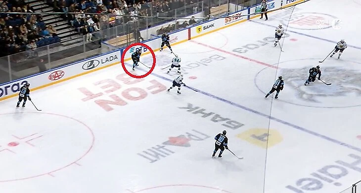 Защитник Роберт Хэмилтон искал возможность для начала атаки – они вместе с Вадимом Морозом обыгрывались в своей зоне, не подпуская соперников к шайбе. В итоге канадец сместился к борту у синей линии и скинул назад партнеру. Намерение было верным: у белоруса появлялось больше пространства, он мог набрать скорость или отдать длинный пас через всю среднюю зону.