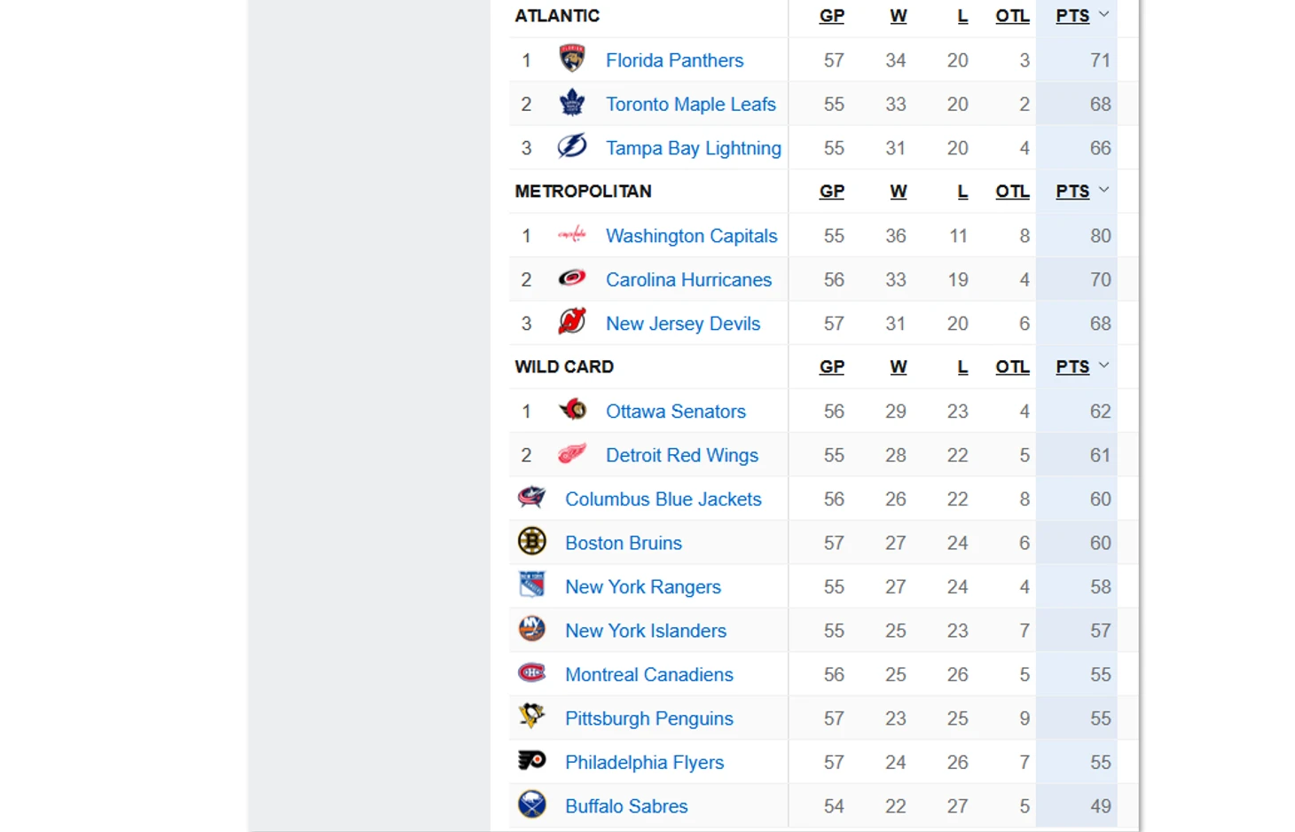Команды провели разное количество матчей, но не намного. В борьбе за Wild Card последним сейчас идёт Детройт. Явным аутсайдером идёт только Баффало. Монреаль, Питтсбург, Филадельфия, отстают всего на 6 очков, имея больше отставание по возможностям, чем по очкам. Про Айлендерс и Коламбус я писал выше. Рейнджерс отстаёт на 3 очка, Бостон на 1.