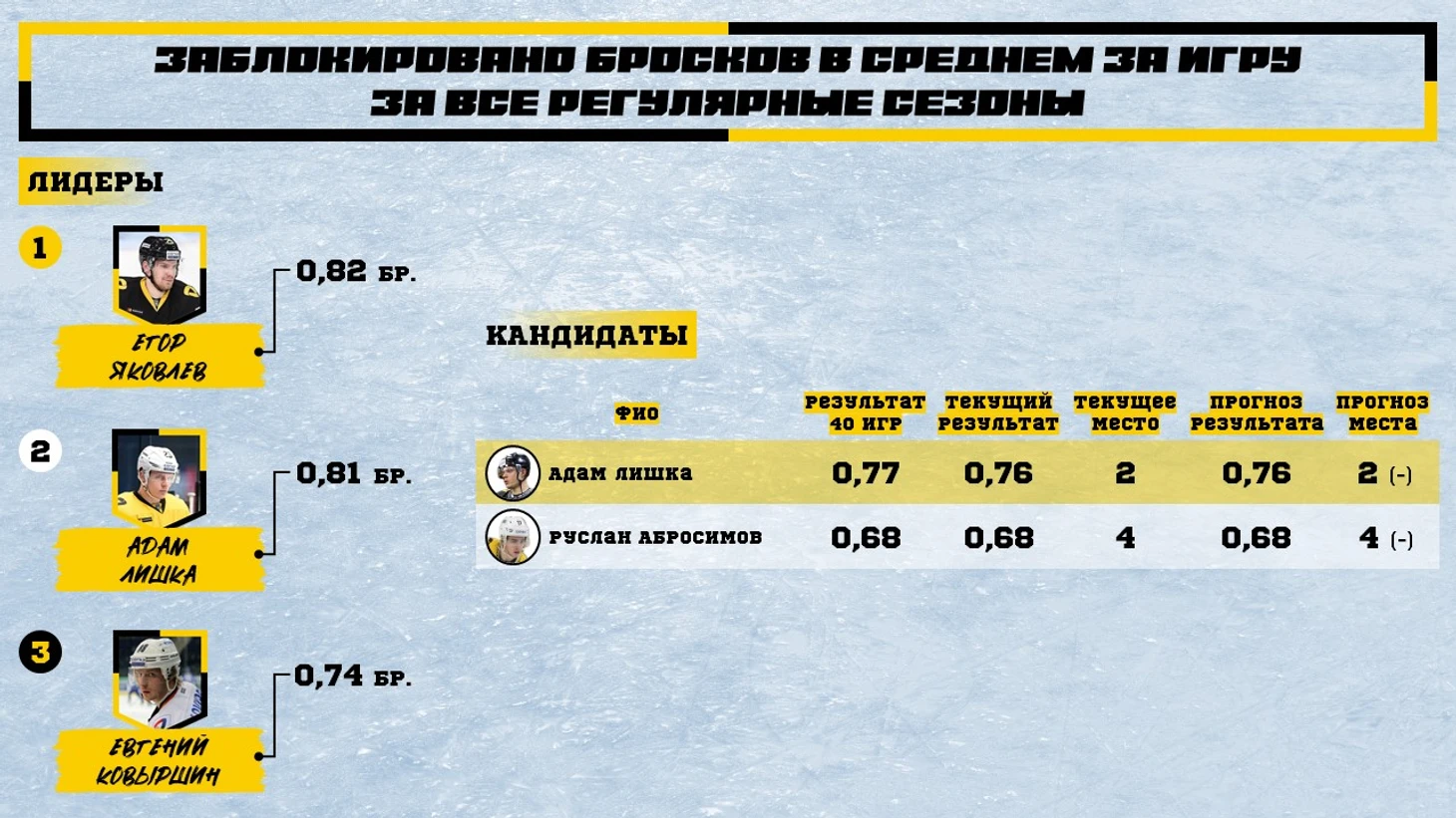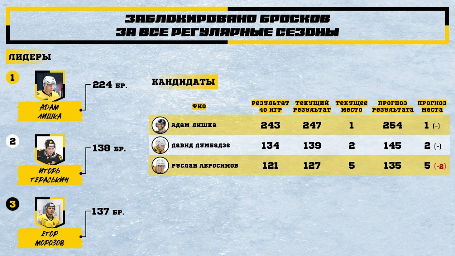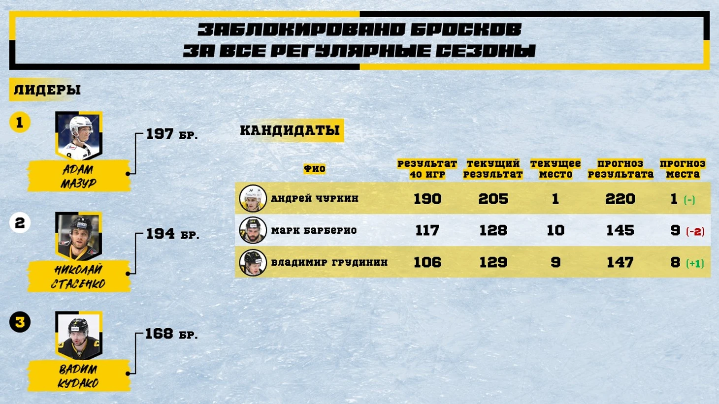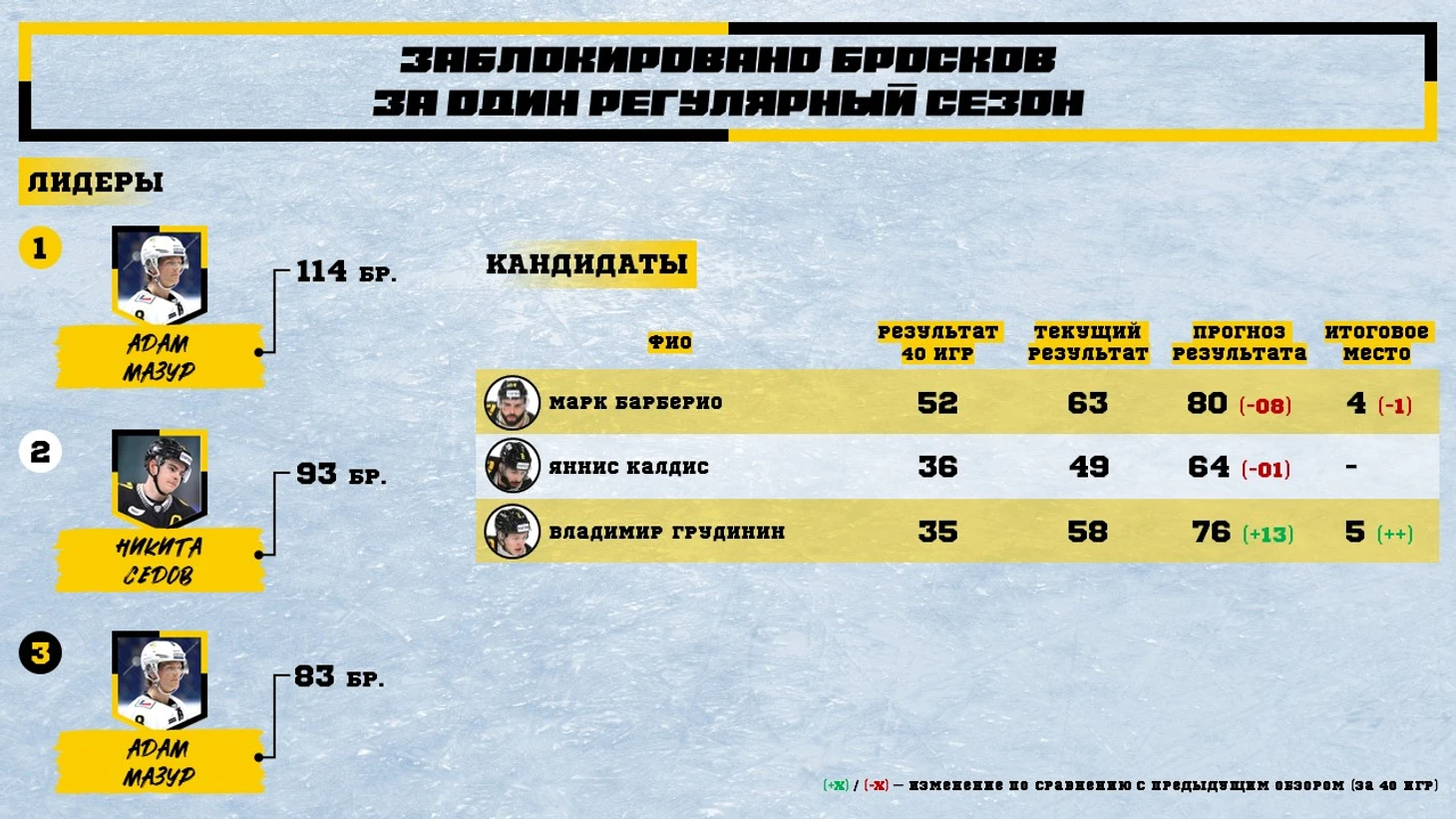 Андрей Чуркин вышел на единоличное первое место по заблокированным броскам и продолжает отрываться от второго места. Больше изменений в тройке не прогнозируется.