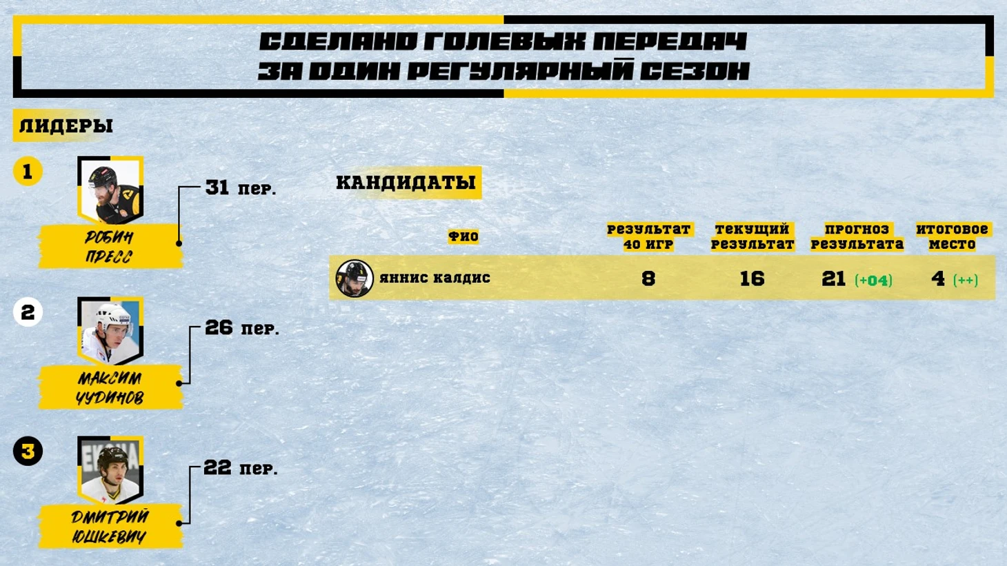 Впервые в этом сезоне в мониторинг включен показатель по голевым передачам – Калдис активно стал набирать очки и стал очень близок к тройке лидеров. Сейчас расчетный прогноз 4 место, но результат Юшкевича все же под угрозой. Яннису нужно сделать 6 голевых передач за 15 матчей – не такая уж и невозможная задача.