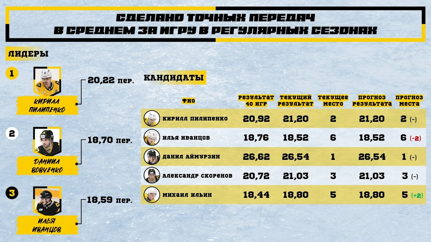 А по количеству точных передач за игру у Аймурзина нет конкурентов, и он точно останется первым с огромным отрывом. Скоренов и Пилипенко борются друг с другом за 2-3 места.