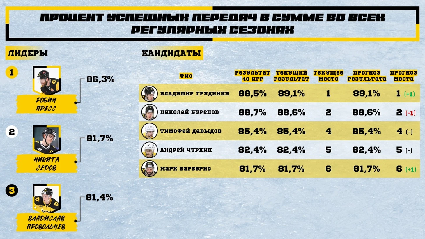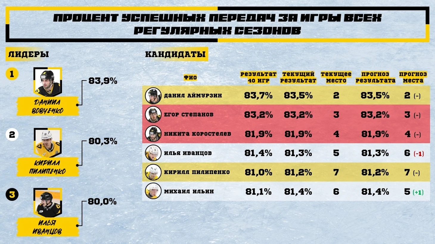Несмотря на хорошую точность передач в целом в этом сезоне, по сумме всех сезонов картина не так проста. На текущий момент Вовченко умудряется сохранить свое лидерство, а вот преследует его только Аймурзин. Степанов не играет, не ухудшает свои показатели, поэтому наверняка останется на 3 месте, до следующих сезонов.