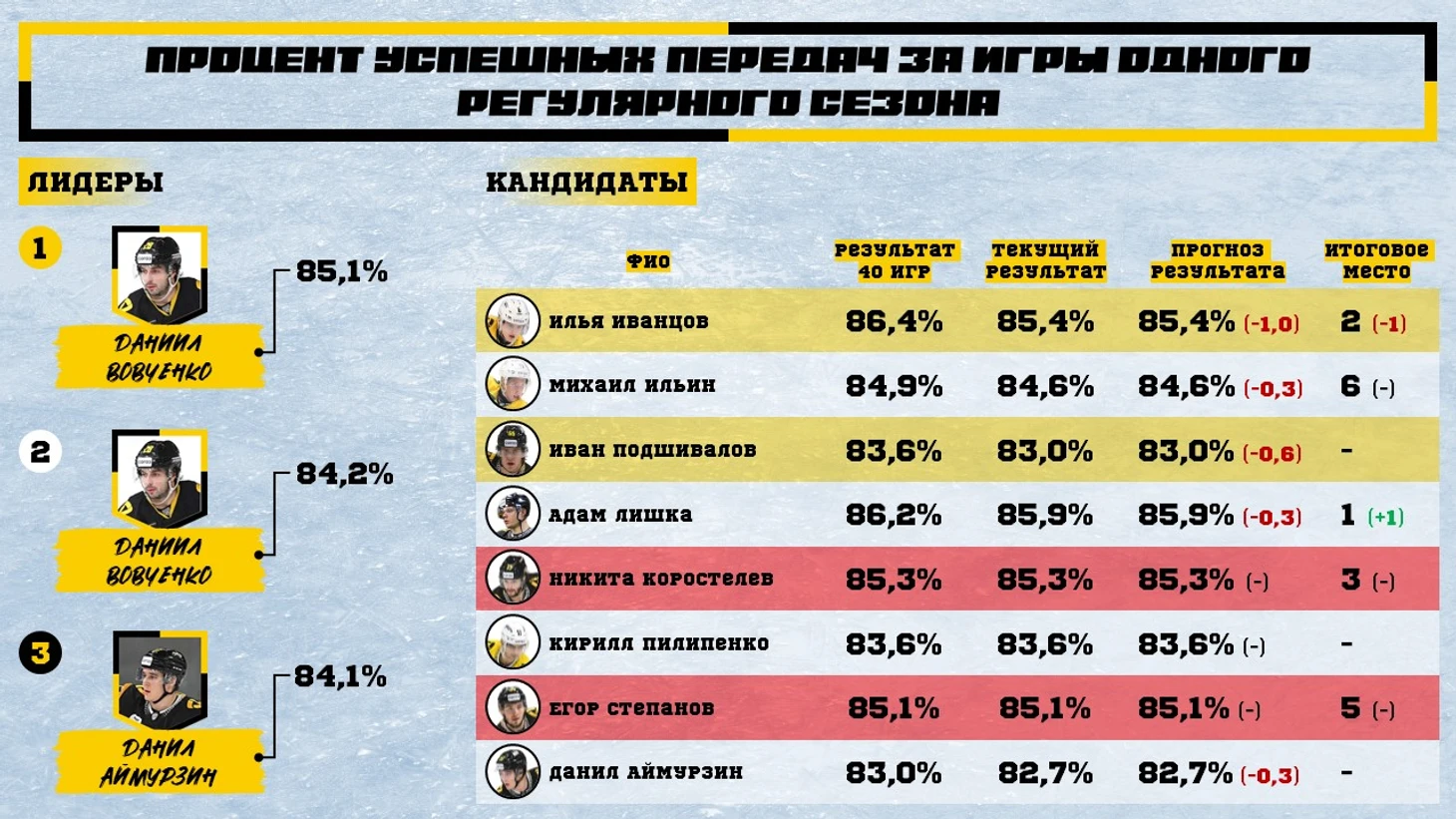 В точности передач по-прежнему много кандидатов, причем в лидеры вырвался Адам Лишка. Ильин может догнать Степанов и войти в тройку, если станет меньше ошибаться.
