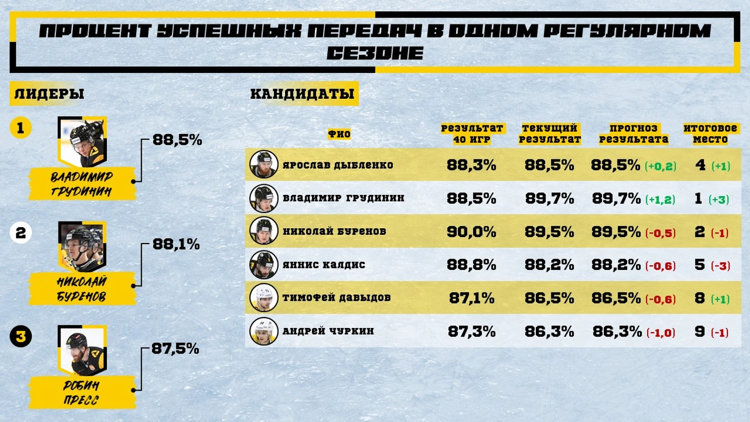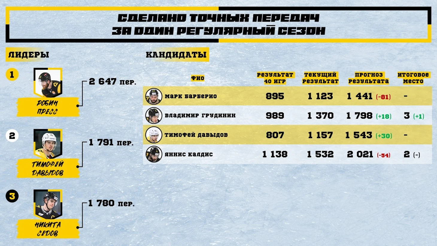 По суммарному количеству точных передач уже 3 защитника обогнали второе место, но до первого пока что добраться не смогут. В итоге Барберио, Давыдов и Грудинин определят, кто на каком месте останется по итогу сезона.