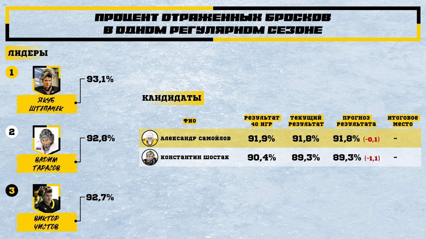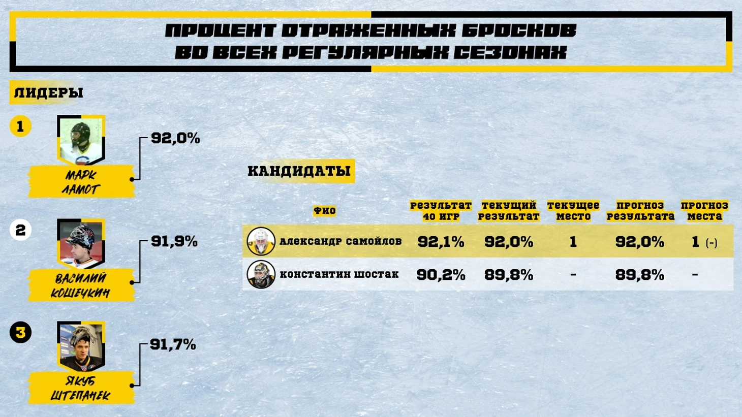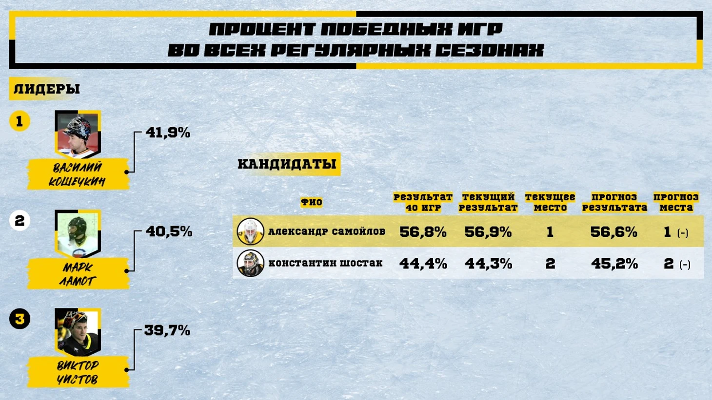 Процент победных игр – шикарный сезон позволяет обоим вратарям держаться выше предыдущего рекорда. Самойлов на 99% станет первым, а Шостак должен занять второе место.