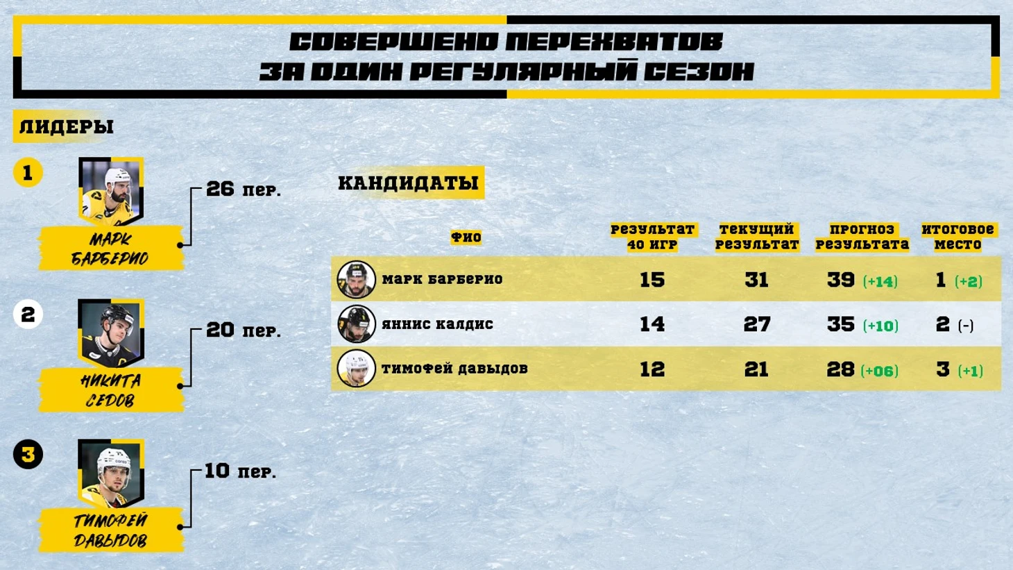 Перехваты. Вот тут у защитников раздолье. Уже 2 игрока преодолели прошлогодний рекорд, а третий на очереди. Так что на 99% у нас будет полностью новая тройка лидеров с новыми результатами, причем скорее всего и останутся Барберио, Калдис и Давыдов в таком же, как сейчас порядке.