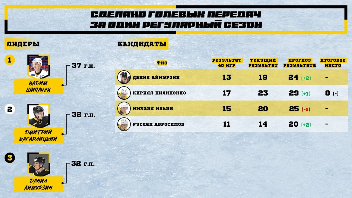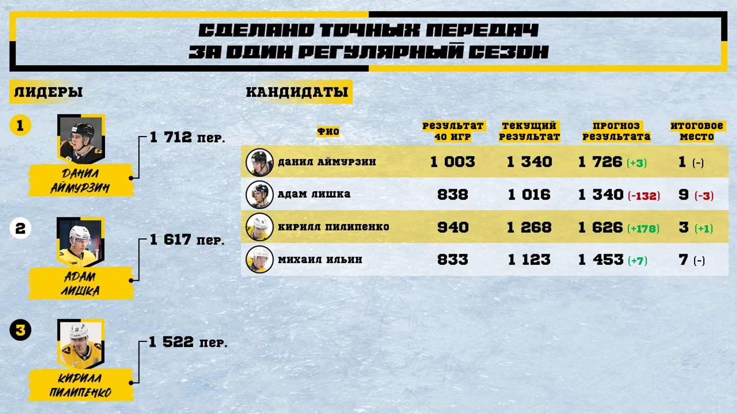 Передачи за игру – кроме Аймурзина ни у кого нет шансов на тройку, да и ему нужно приложить усилия, чтобы удержаться.