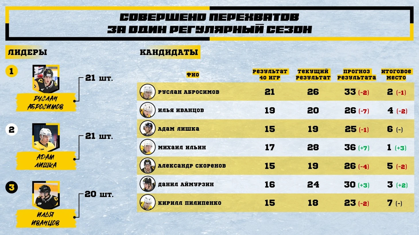 В перехватах, так же, как и у защитников, результаты сильно лучше прошлогодних: Абросимов, Ильин и Аймурзин уже преодолели рекорд и между собой распределят 1-3 места.