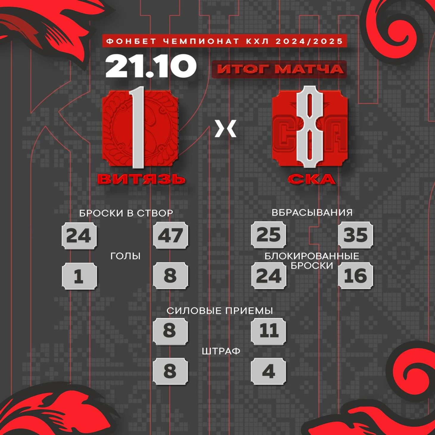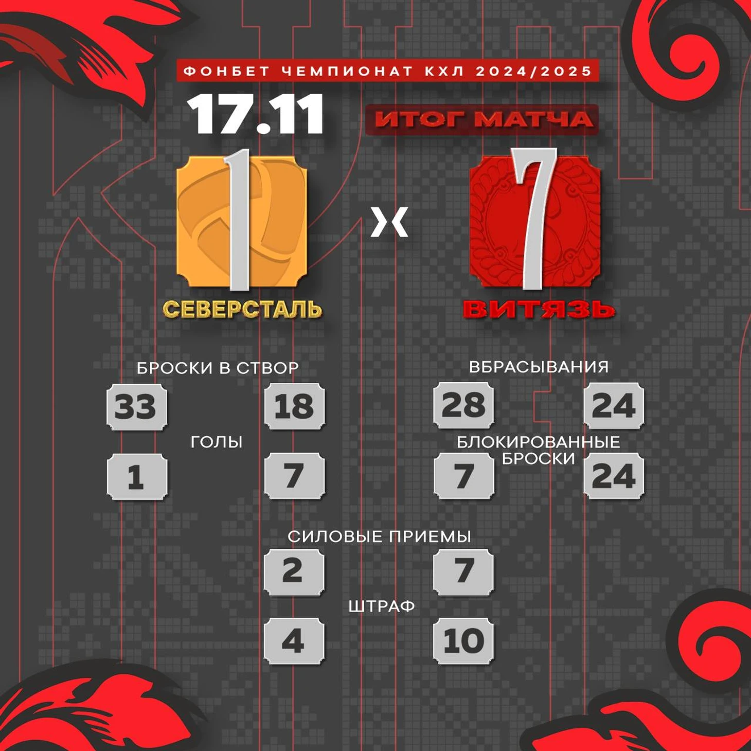 Переломить ход встречи череповчане не смогли, парадоксально проведя третий период хуже первых двух. Да, по броскам у «сталеваров» внушительное преимущество, но, во-первых, гости из Подмосковья быстро повели в счете, во-вторых, «Северсталь» необычайно много для себя блокировала (24 броска, из которых 13 в последней трети игры), и, в конце концов, «Витязь» существенно чаще удалялся (5 штрафов против 2 у хозяев). По три очка набрал каждый в первой тройке команды Десяткова, прекрасный матч провел Максим Дорожко (32/33). Забавно, что единственную шайбу «черно-желтые» забросили в меньшинстве (отличился Аймурзин при счете 0:5).