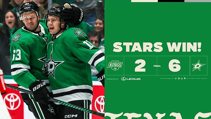 «Даллас Старз»-»Лос-Анджелес Кингз» 6:2. Руп Хинтц отдал 4 результативные передачи, Логан Станковен забросил 2 шайбы, Сэм Стил и Джейсон Робертсон набрали по 2 очка (1+1), Томас Харли отдал 2 результативные передачи, Джэк Оттинджер отразил 29 бросков.
