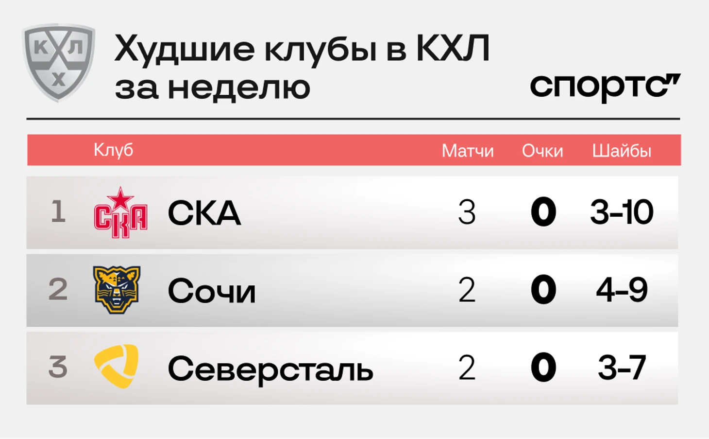 Худшие клубы: СКА, «Северсталь» и «Сочи» всем проигрывают