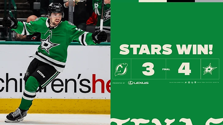 «Даллас Старз»-»Нью-Джерси Дэвилз» 4:3. Томас Харли за 5 секунд до конца матча забросил победную шайбу. Руп Хинтц набрал 3 очка (1+2), Уайтт Джонстон и Томас Харли набрали по 2 очка (1+1), Джейсон Робертсон отдал 2 результативные передачи, Кейси ДеСмит отразил 25 бросков. У гостей Нико Хишир и Тимо Майер набрали по 2 очка (1+1), Йеспер Братт и Люк Хьюз отдали по 2 результативные передачи. «Звёзды» выиграли 3 игру подряд.