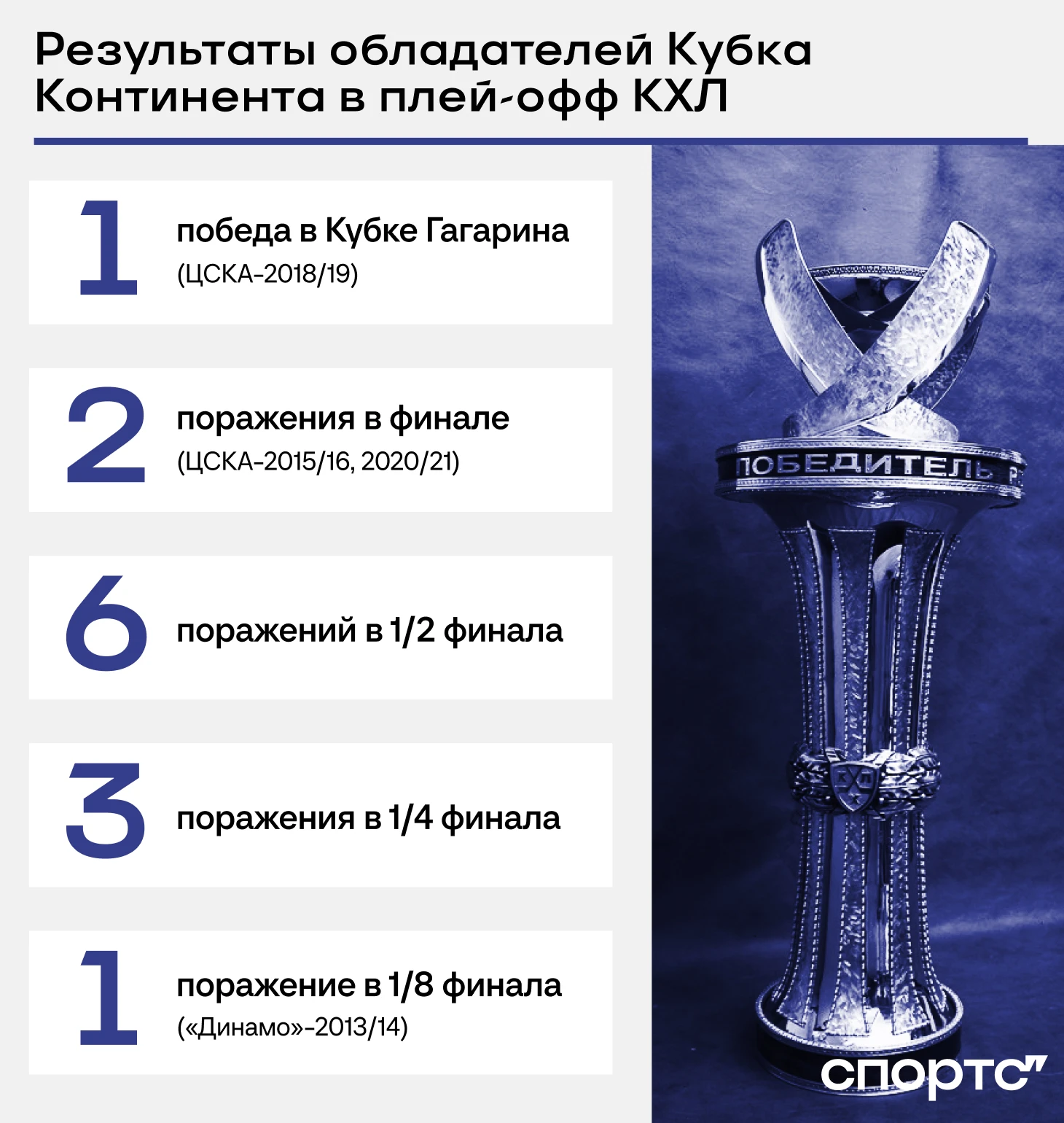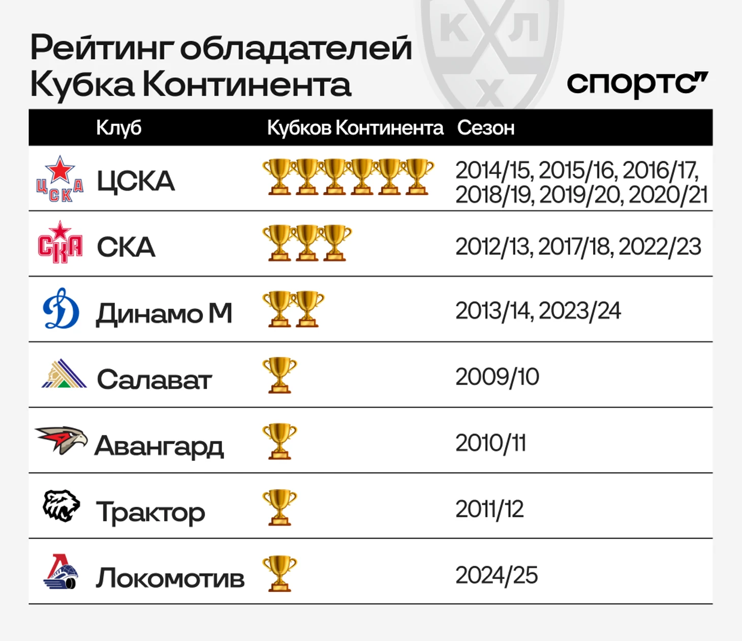 Нельзя сказать, что результаты обладателей Кубка Континента в плей-офф совсем удручающие. Вот только лишь ЦСКА после выигранной регулярки добирался до финала Кубка Гагарина и даже побеждал в нем. Но у москвичей было и больше всех попыток сделать трофейный дубль – они шесть раз забирали Кубок Континента.