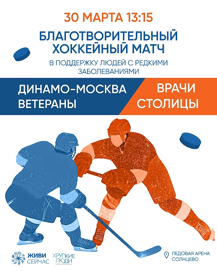 Фонды «Живи Сейчас» и «Хрупкие люди» проведут благотворительный хоккейный матч, чтобы поддержать людей с БАС и несовершенным остеогенезом. Это редкие заболевания – они встречаются у небольшого количества людей относительно общей численности населения.