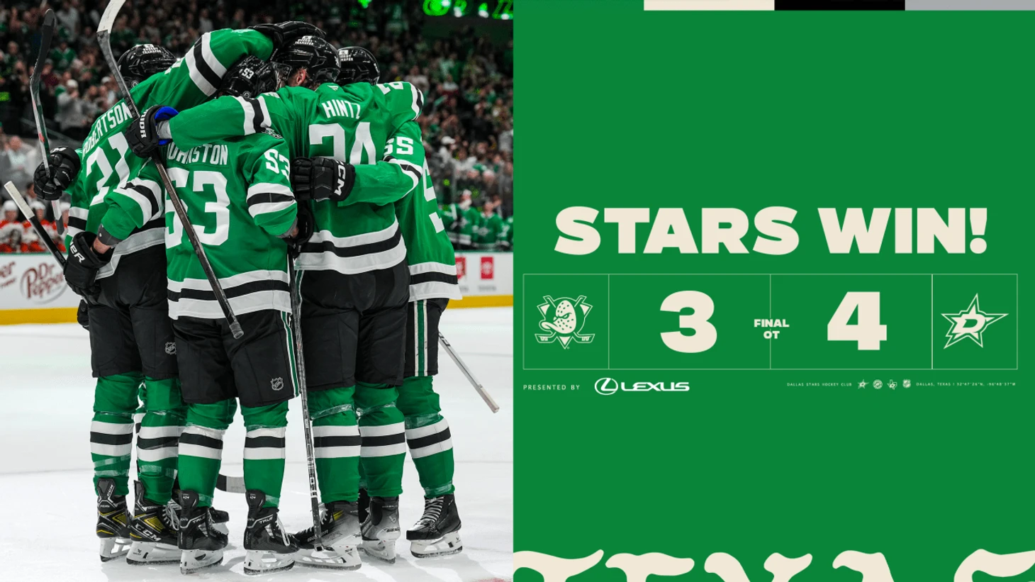 «Даллас Старз»-»Анахайм Дакс» 4:3 (ОТ). Микаэль Гранлунд в овертайме принёс победу хозяевам. Томас Харли набрал 3 очка (1+2), Микаэль Гранлунд забросил 2 шайбы, Руп Хинтц отдал 2 результативные передачи, Джэк Оттинджер отразил 22 броска. У гостей Лео Карлссон забросил 2 шайбы, Павел Минтюков отдал 2 результативные передачи.