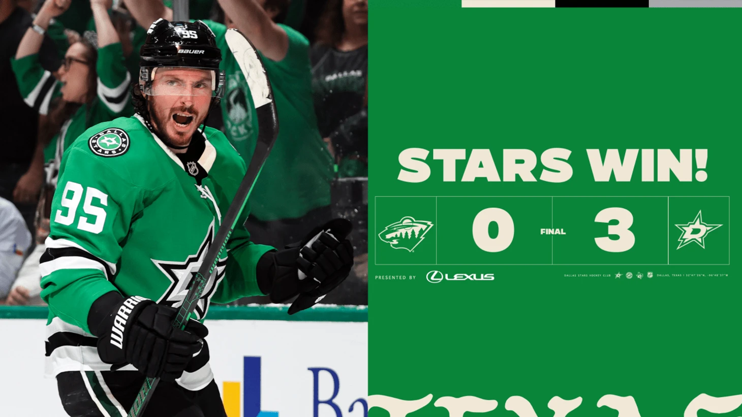 «Даллас Старз»-»Миннесота Уайлд» 3:0. Руп Хинтц отдал 2 результативные передачи, Джэк Оттинджер отразил 32 броска и сыграл второй сухой матч в сезоне.