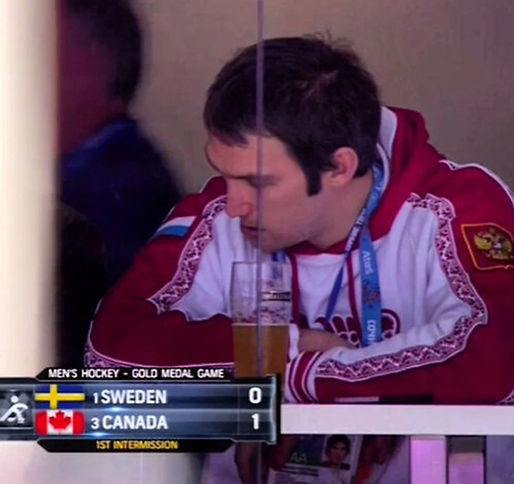 Можно вспомнить Олимпиаду в Сочи, когда во время хоккейного финала его поймали камеры. Ови смотрел матч с кружкой пива и явно досадовал, что не находился в этот момент на льду.