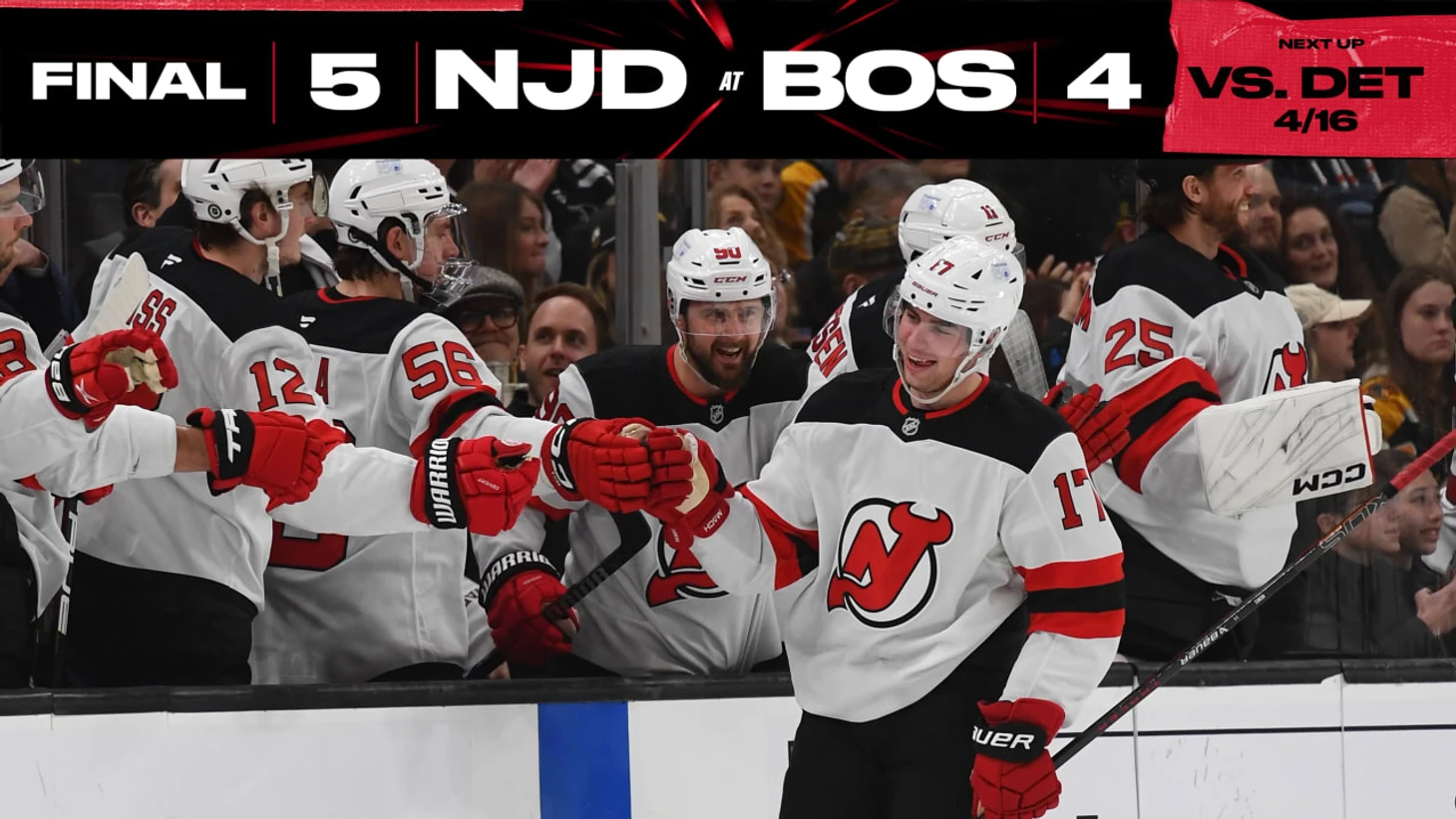 «Бостон Брюинз»-»Нью-Джерси Дэвилз» 4:5 (ОТ). Брайан Люмуден в овертайме принёс победу гостям. Тимо Майер набрал 3 очка (1+2), Доусон Мерсер набрал 2 очка (1+1), Нико Хишир и Люк Хьюз отдали по 2 результативные передачи, Джэк Аллен отразил 20 бросков. У хозяев Давид Пастрнак набрал 2 очка (1+1), Никита Задоров отдал 2 результативные передачи, Марат Хуснутдинов забросил одну шайбу.