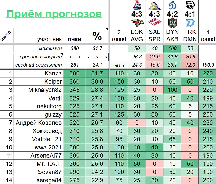 Трактор - Динамо Мн (точность предсказания исхода 4:1 — 12,3%!) и Салават Юлаев - Спартак (4:3 — 15,8%). Уфимцы и челябинцы остаются самыми непредсказуемыми второй раунд подряд (видно по цветовой гамме в таблице).