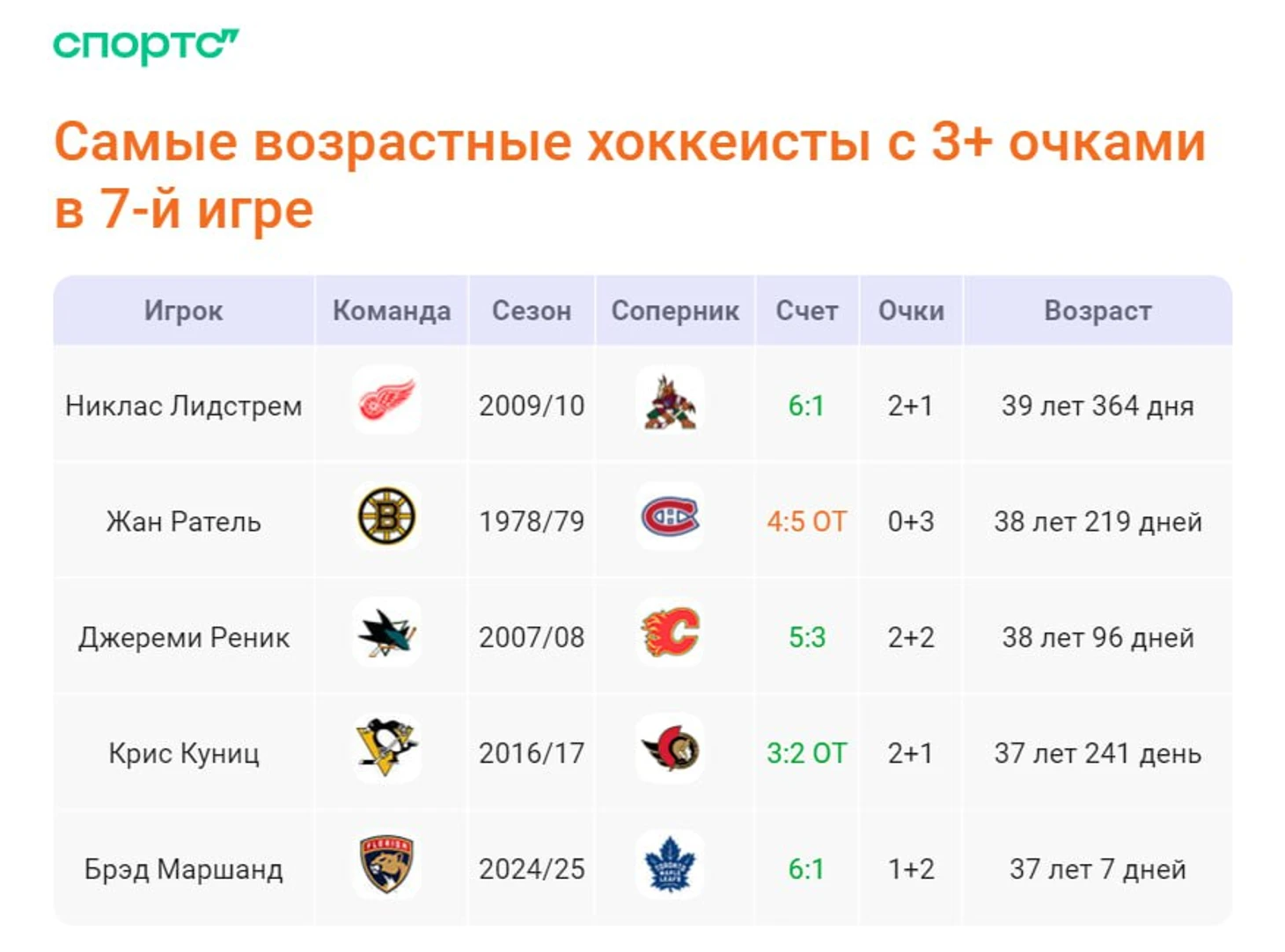 Еще одно достижение Маршанда – он стал пятым самым возрастным хоккеистом, который набрал 3+ очка в седьмой игре серии. Еще и превзошел показатель Александра Овечкина по очкам в таких матчах среди действующих игроков – 4+6 в 13 играх против 4+4 в 12.