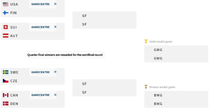 Фаворитами четвертьфиналов являются сборные Канады и Швейцарии. Бывало всякое, но вряд ли датчане или австрицы смогут сотворить сенсацию. В двух других парах все более непредсказуемо. В пользу шведов говорит преимущество своей площадки. Трибуны будут поддерживать команду изо всех сил. По составу она выглядит сильнее чешской сборной, в четырех матчах из семи сыграла на ноль, а уступила только канадцам. Исходя из этих предположений в полуфиналах должны быть следующие пары: