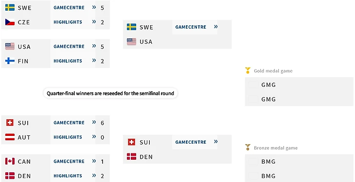 Букмекеры ожидают увидеть в финале сборные Швеции и Швейцарии. По поводу альпийской сборной сомнений нет. Хоть датчане и являются очень обученной и дисциплинированной командой, но выдать два столь эмоциональных матча подряд им будет сложно. Во второй паре полуфиналистов на стороне шведов опыт и родные трибуны. Все оставшиеся поединки пройдут в Стокгольме на «Авичи-Арене». Таким образом в финале могут встретиться сборные Швеции и Швейцарии, в борьбе за бронзу команды США и Дании.