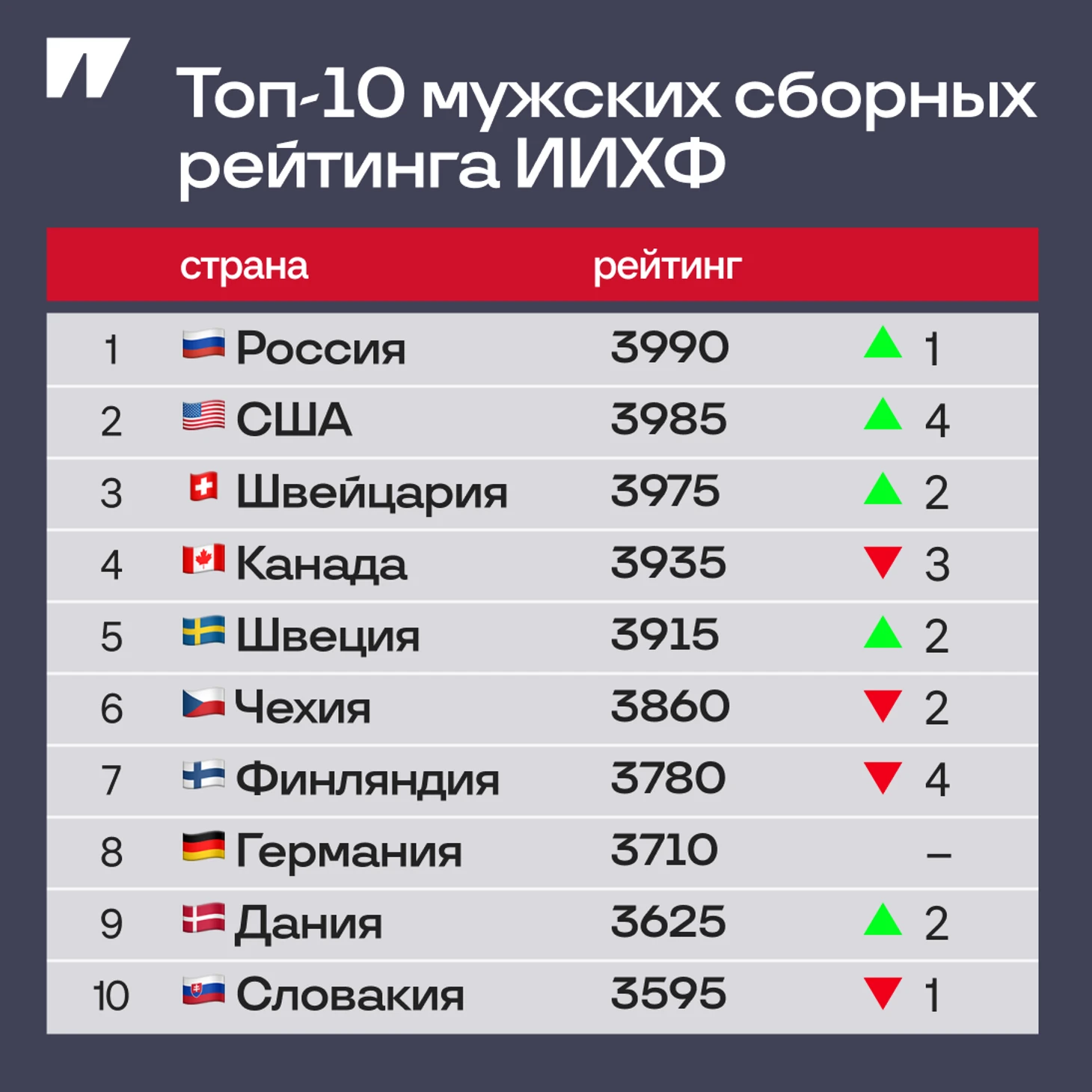 После обновления рейтинга в прошлом году возникла неожиданная ситуация: Россия занимала второе место (4065 очков), уступая только канадцам (4100). Уже год назад стало понятно, что, если Канада останется без медалей на ЧМ-2025, то наша сборная возглавит рейтинг. Так и случилось: канадцы сенсационно проиграли в четвертьфинале Дании (1:2).