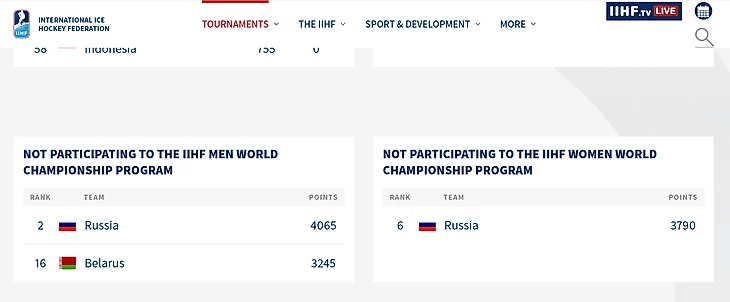 И все же представители ИИХФ пошли на уловку – обновили рейтинг визуально. Теперь на официальном сайте Международной федерации отстраненные россияне и белорусы указываются в отдельной таблице, а не в общем зачете. Но места все равно подтягиваются из основного рейтинга.