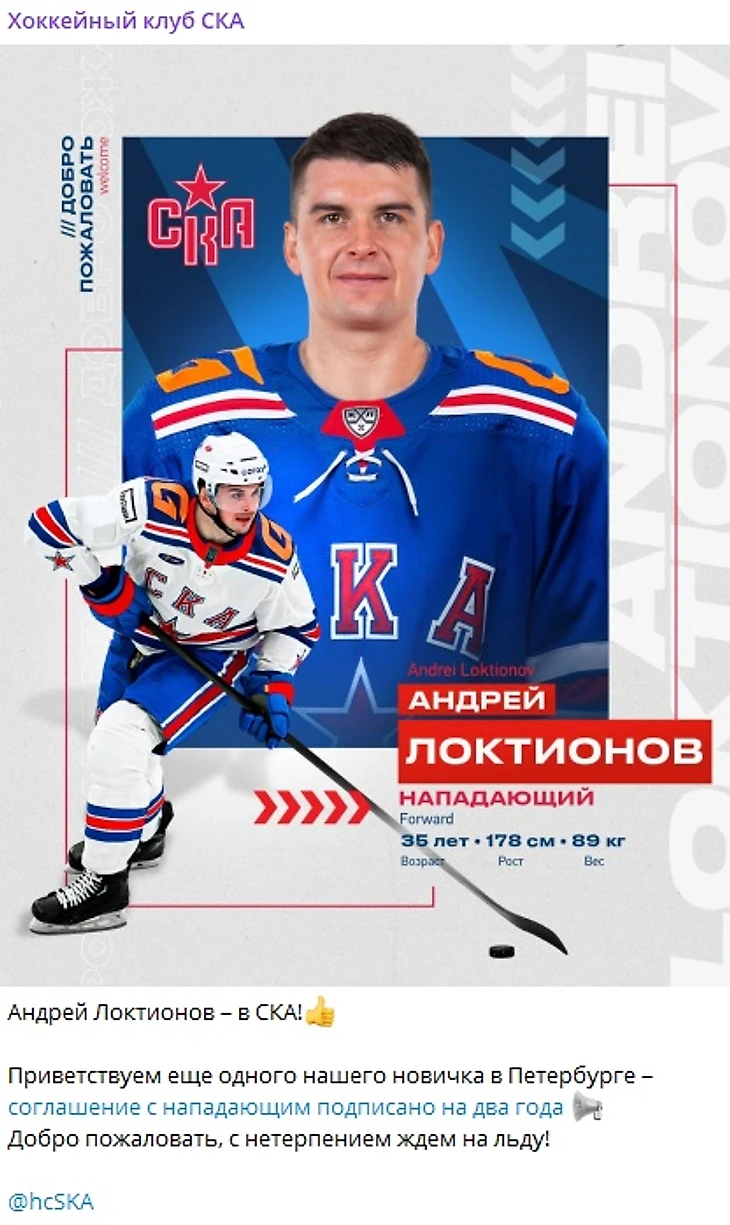 Хоккейный СКА при главном тренере Игоре Ларионове продолжает укрепляться «ларионовскими» людьми. Сегодня СКА подписал контракт с центральным нападающим Андреем Локтионовым, которого Ларионов вел в качестве агента на рубеже нулевых и десятых годов.