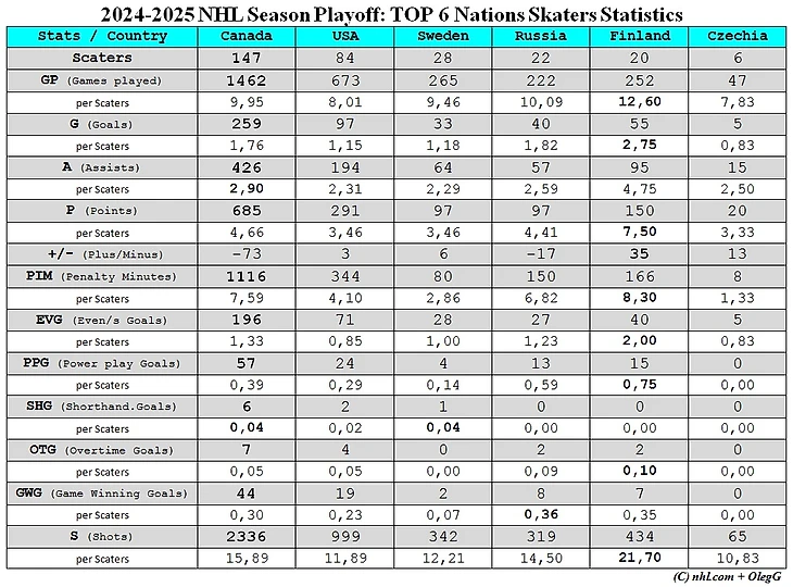 Вот решил посмотреть, какого представительство полевых игроков в регулярном сезоне NHL 2024-2025 по странам.