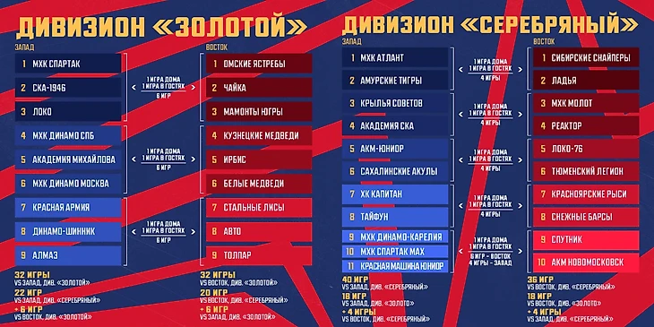 Команды «Золотых» дивизионов проведут по шесть матчей с соперниками из другой конференции. Действующий чемпион МХК «Спартак» и финалисты двух последних сезонов «СКА-1946» и «Локо» в регулярном чемпионате дважды сыграют с обоими полуфиналистами Востока «Омскими Ястребами» и «Чайкой», а также с одной из лучших команд конференции «Мамонтами Югры».