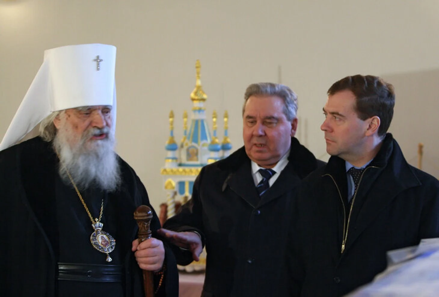 В декабре они приезжают ко мне, мы садимся в этом же кабинете: тут Мединский, губернатор Назаров сидел вот здесь на вашем месте, а вот тут Голушко (в 90-х вице-губернатор при Полежаеве, затем депутат Госдумы и сенатор от Омской области, сейчас живет за границей, в России на его имущество наложен арест, в базе судебных приставов за Андреем Голушко значится долг больше чем в 2 миллиарда рублей – по иску Генпрокуратуры – Спортс’‘). И они мне говорят: «Леонид Константинович, помогите построить Воскресенский собор».