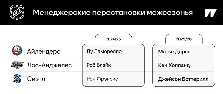 Новым генменеджером назначили Матье Дарша, который до этого помогал Жюльену Брисбуа в «Тампе». Дарш провел исторический для «Айлендерс» драфт-2025, где клуб под первым номером выбрал защитника Мэттью Шефера. В день драфта Дарш сделал первый громкий обмен: отправил в «Монреаль» Ноа Добсона и получил Эмиля Хейнемана вместе с двумя пиками первого раунда.