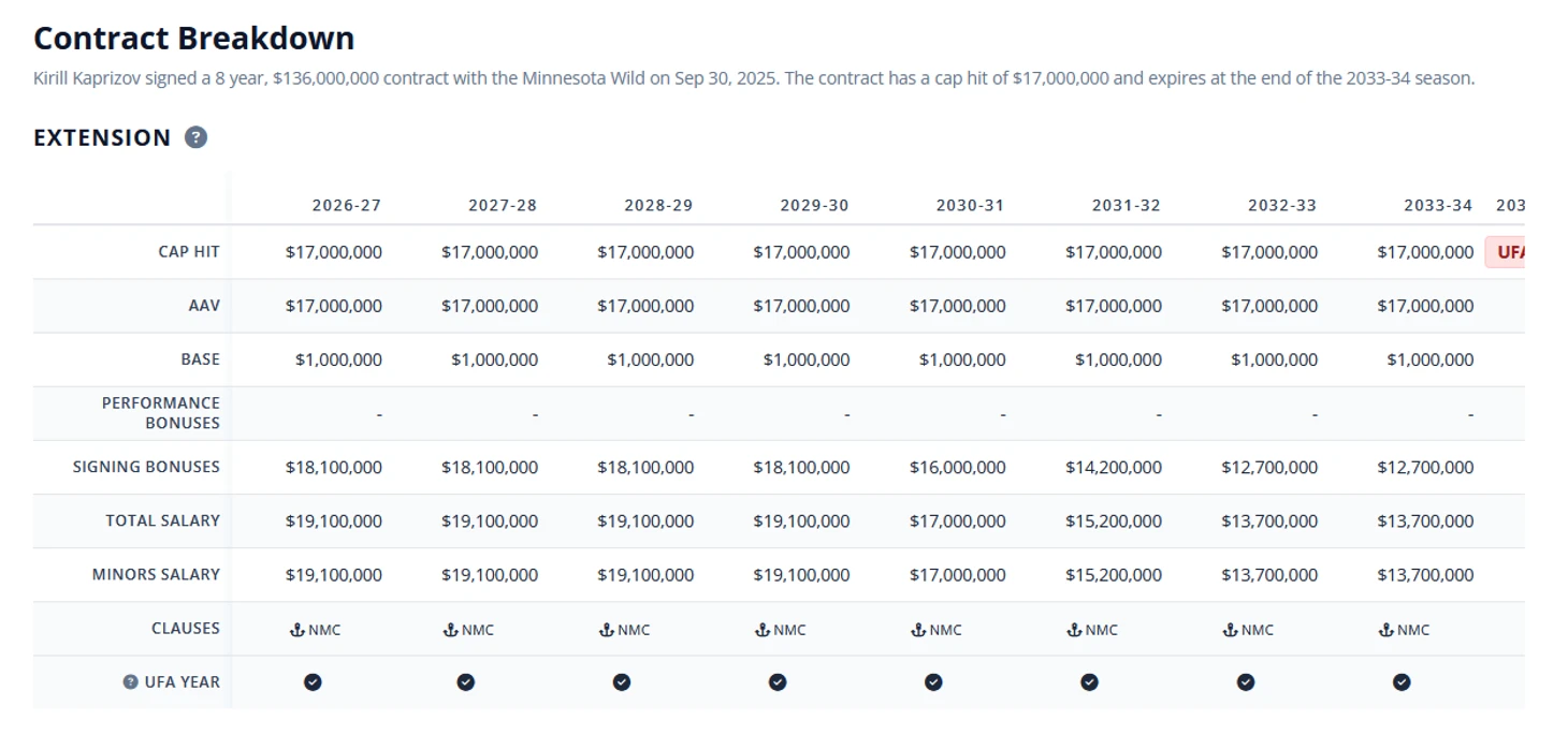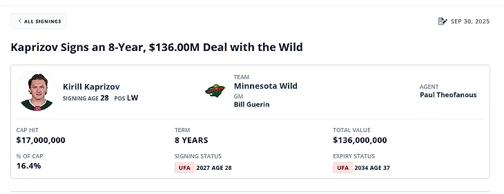 Скорее, пример этой сделки будет использоваться в медиа, как оправдание своих заключенных контрактов со звездами с переплаченным AAV, по типу – да вы на сумму Капризова посмотрите. Тем более, во всех фронт-офисах прекрасно понимают мотивы заключения нового договора Миннесотой с Кириллом на такую сумму. Это сознательное бизнес-решение владельца клуба о переплате по контракту своему звездному игроку являющимся лицом франшизы.