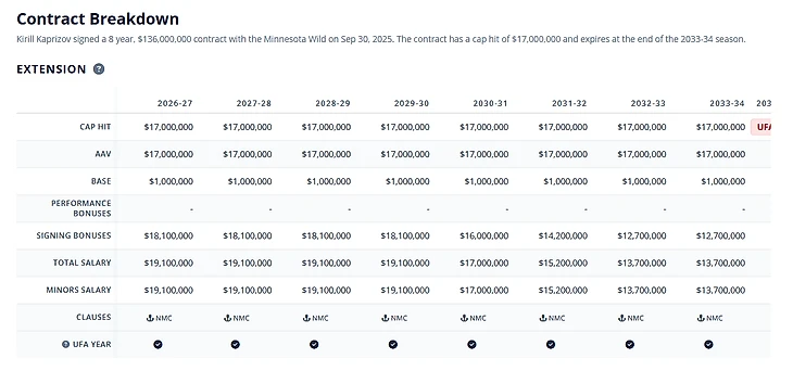 Небольшая разница в реальных деньгах в пользу Капризова, если бы соглашение было на AAV $14.0mln несмотря на более ценную позицию Драя.