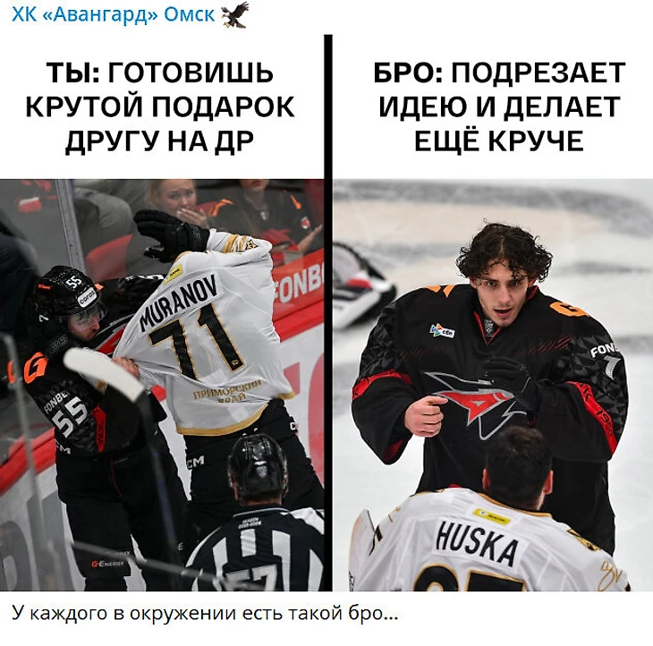 Такая битва в Омске явно выделяется на фоне обычных драк полевых из других матчей. Телеграм-канал «Авангарда» лучше остальных передал эмоцию.