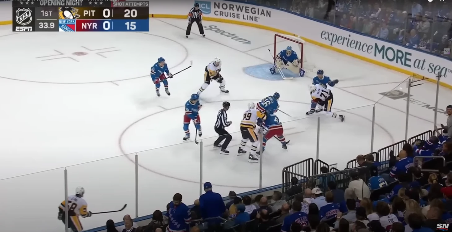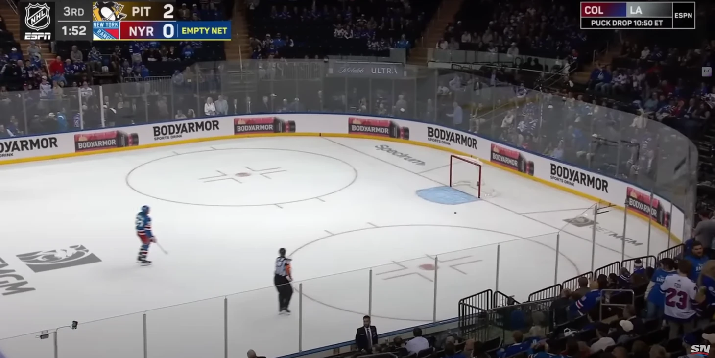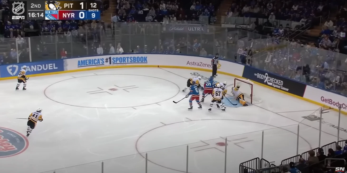 Первый период катился к нулевой ничьёй, когда после проброса случилось то самое вбрасывание у ворот «Рейнджерс». На точку встал Евгений Малкин. Забегая вперёд, скажу, что у Джино в этом матче ужасный показатель в игре на вбрасываниях. Из 7 он выиграл всего одно. Именно то, о котором сейчас пойдёт речь.