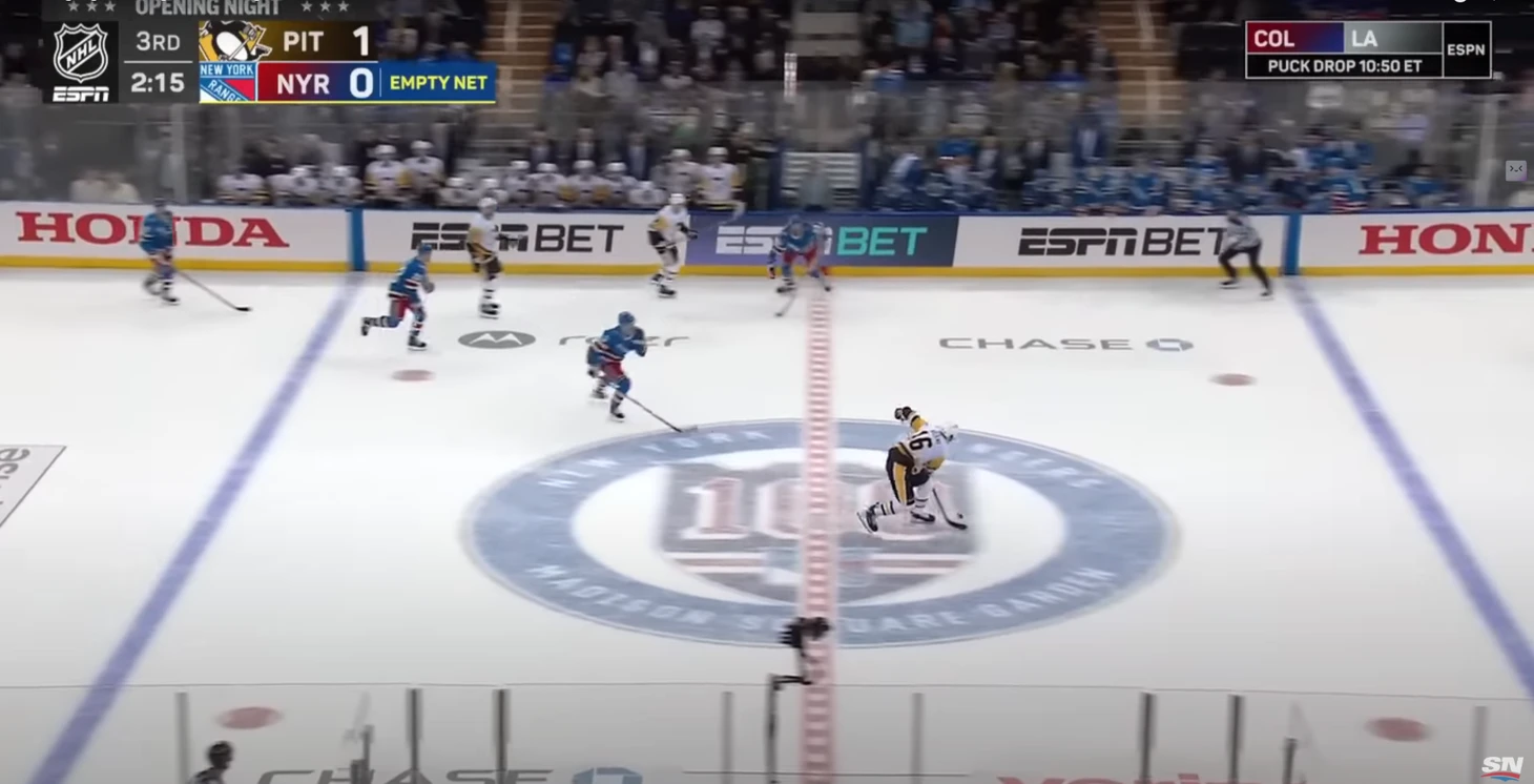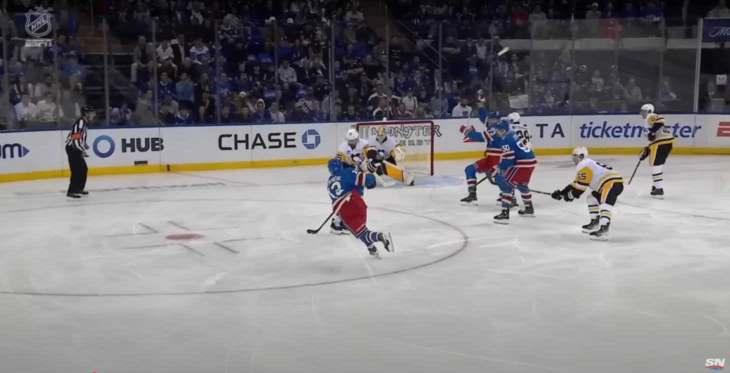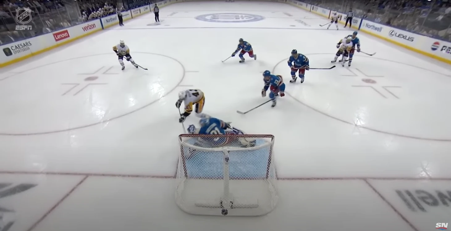 Первый период катился к нулевой ничьёй, когда после проброса случилось то самое вбрасывание у ворот «Рейнджерс». На точку встал Евгений Малкин. Забегая вперёд, скажу, что у Джино в этом матче ужасный показатель в игре на вбрасываниях. Из 7 он выиграл всего одно. Именно то, о котором сейчас пойдёт речь.
