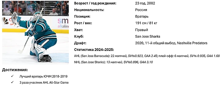 Аскаров редкий случай, когда вратарь уже готов к роли первого вратаря, но при этом всё ещё формально входит в категорию «новичков». Он провёл три года в AHL, отшлифовал технику и доказал способность тащить команду (серия из 21 побед подряд). Его конкурент Алекс Неделькович типичный «страхующий» вратарь, а значит Аскаров получит объём. Если «Шаркс» улучшат свою оборонительную игру, у Ярослава есть все данные сыграть на 0,91+ и вытащить команду со дна таблицы, что даст ему реальный шанс в голосовании за Calder Trophy, как Дастину Вульфу в прошлом сезоне.
