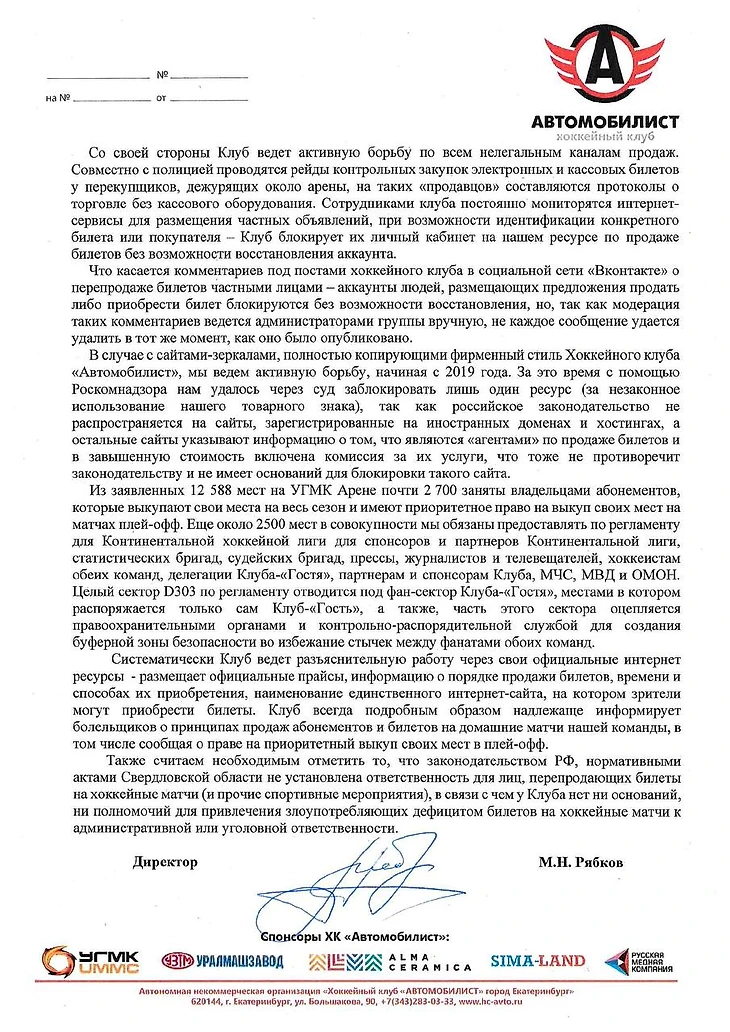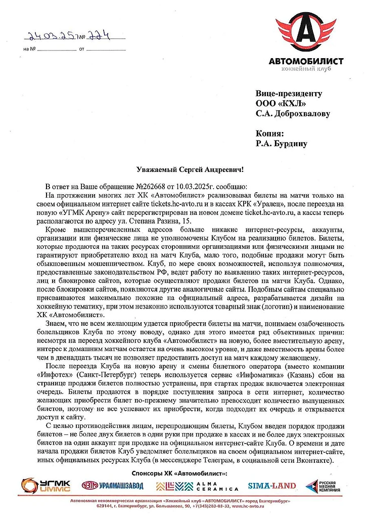 Но, к большому сожалению, переезд на арену не решил проблему с покупкой билетов. Как только начался плей-офф, все испытания, которые были в КРК «Уральце» продолжились. Нужно быть реальным счастливчиком, пройти «семь кругов ада» и иметь огромное терпение и выдержку, что бы купить заветный билет. Болельщики продолжали негодовать, если зайти в комментарии в официальных сообществах команды в соц.сетях можно увидеть огромное количество гневных комментариев. Некоторые пишут в КХЛ, кто-то в сам клуб, результат нулевой. Проблема не решается и не понятно хочется ли клубу вообще это решать. Ниже прикрепляю скрин ответа клуба одному из болельщиков, по моему мнению это просто «отписка».