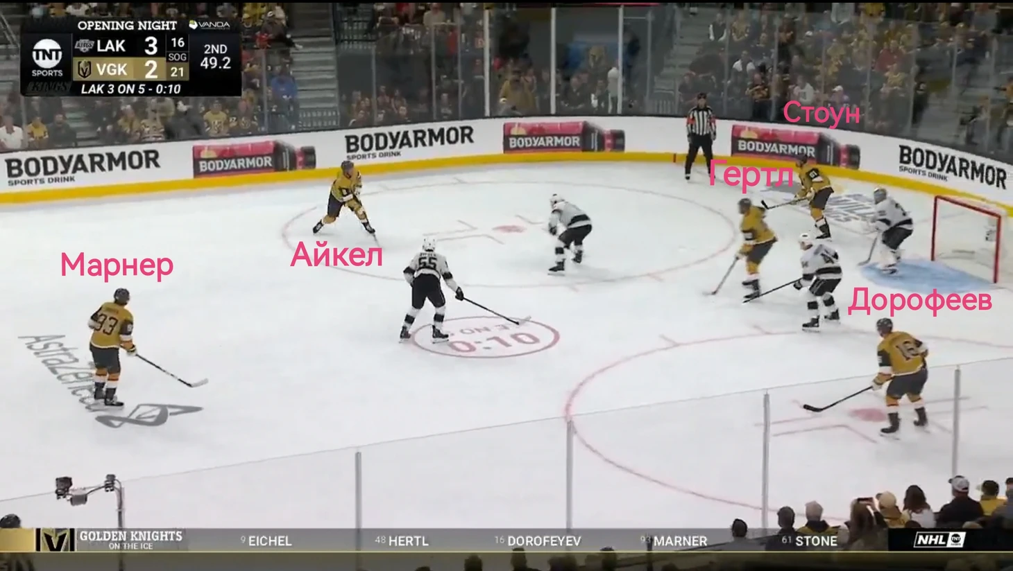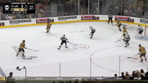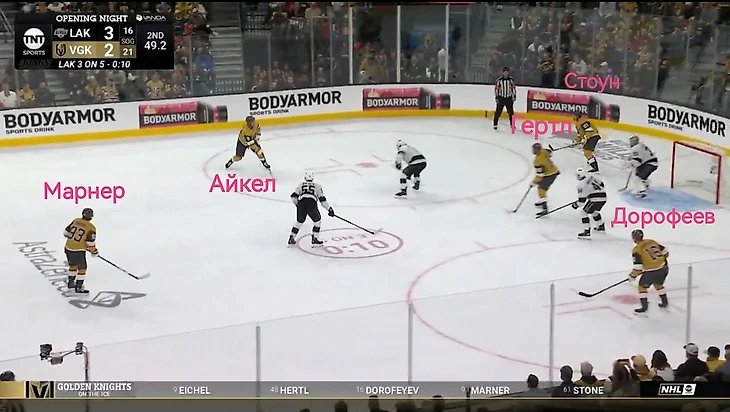 А теперь смотрите: это первый матч сезона, против «Лос-Анджелеса». «Вегас» горел в две шайбы, но отличный подарок сделали Алекс Туркотт (5 минут штрафа) и Алекс Лаферрьер (оставил команду в двойном меньшинстве на 73 секунды). Так «Найтс» отыграли одну шайбу: