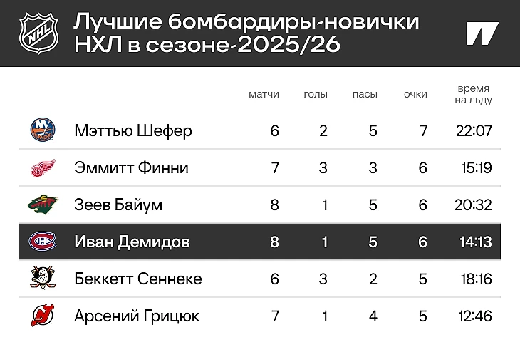 ● Прежде всего, это защитник Мэттью Шефер из «Айлендерс» – первый номер драфта-2025. Он сразу пробился в основу, а потом еще и выдавил Энтони Деанджело из первой пятерки большинства. Шефер уже проводит на льду по 20+ минут. После обмена Ноа Добсона в «Монреаль» именно Мэтт рассматривается как главный атакующий защитник клуба на долгие годы вперед.