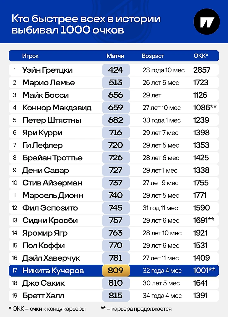 Само по себе достижение лидера «Лайтнинг», может быть, не выглядит уникально – тысячу очков в истории регулярок выбивали ровно 100 человек. Кучеров – реально 101-й.
