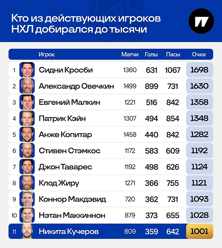 Без них он бы и тысячу выбил раньше, и был бы выше по очкам многих из действующих игроков. Вот, кстати, все, кто выбивали 1000, и еще не закончили с хоккеем в НХЛ. На всякий случай держим в уме Ягра, который не завершил игровую карьеру – вдруг решить вернуться за океан. Пока у него – 1921 очко в 1733 матчах.