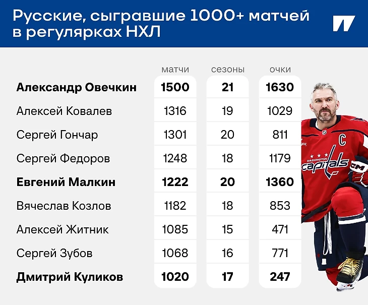 А среди россиян Александр давно ушел в отрыв. Теоретически догнать его могли бы Малкин (1222 матча) и Куликов (1020), но на практике это невозможно. Евгений, вероятно, завершит карьеру в НХЛ одновременно с Овечкиным, а Куликову – 34, и ему уже мешают травмы.