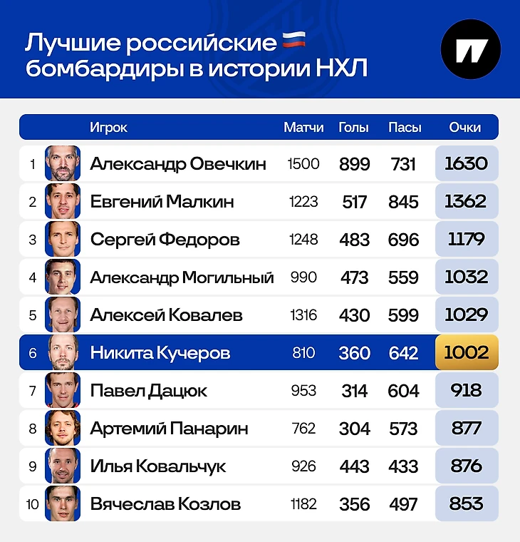 Но начнем с базы. Кучеров стал шестым среди наших с тысячей в НХЛ.