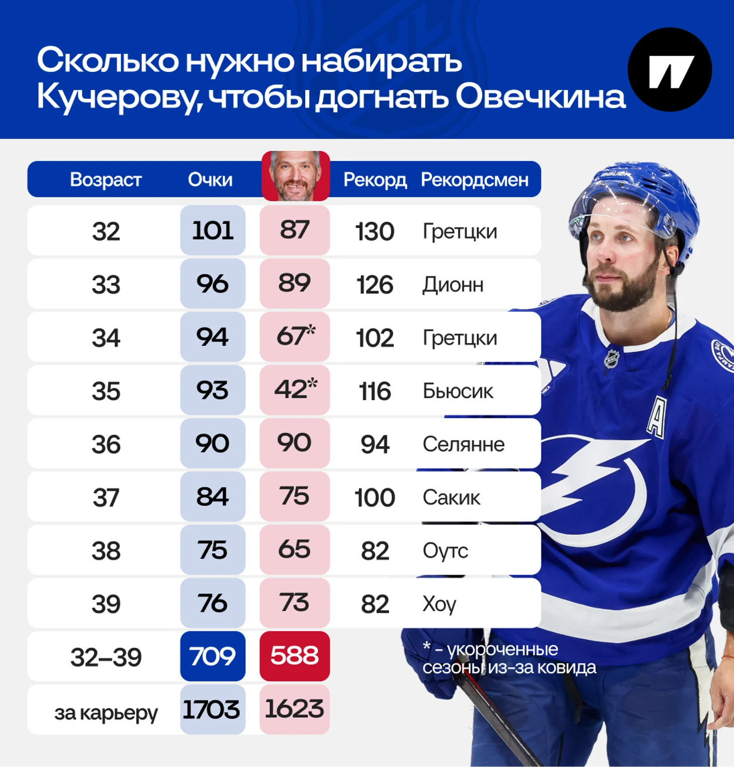 Ну и поскольку Овечкин еще играет, я сделал запас на 80 очков (больше-то он вряд ли наберет в 40 лет), так что Кучерову может хватить и меньше 1700, чтобы его обойти.