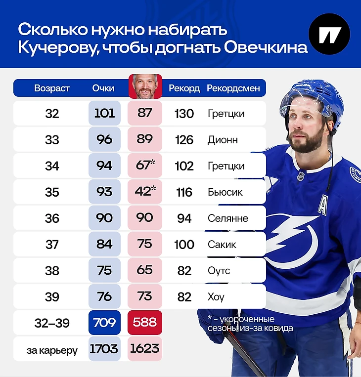 В-третьих, Кучеров добрался до тысячи быстрее Овечкина по затраченным играм, но не по возрасту. Александру было 31 год и без малого 4 месяца, Никите – на год больше. И это, по идее, означает, что Кучерову придется играть дольше или плюс-минус столько же. А ведь Овечкину уже 40, и он продолжает! И не забываем про отставание в 41 очко на отметке 32 года.
